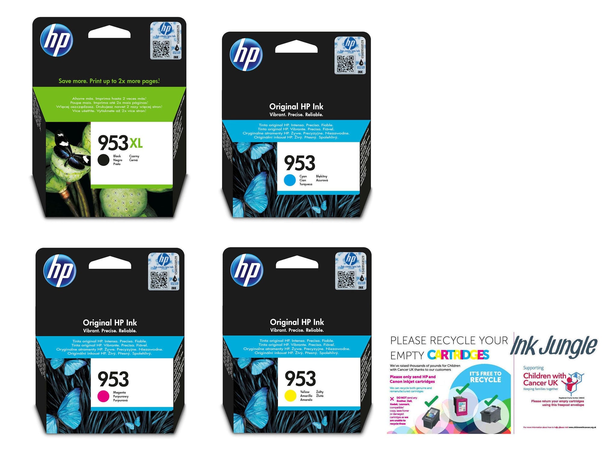 - High capacity 953XL black, standard capacity 953 cyan, magenta, & yellow ink cartridges